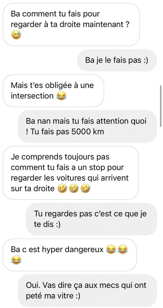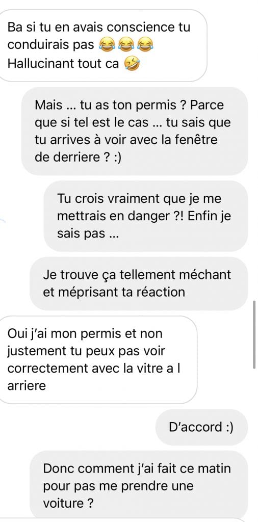J’ai donc fini par reconnaître que Jenifer avait raison. Sans en penser un mot et avec beaucoup de provocation. Puis, j’ai agi comme j’aurais dû le faire dès la première seconde : je l’ai bloquée. La réalité, c’est que j’ai failli lui répondre en vocal, peut-être même en vidéo ou en lui envoyant un court-métrage pour lui montrer que si, il est possible de conduire avec une fenêtre en moins. Puis, j’ai pensé qu’elle n’aimerait pas beaucoup le téléphone au volant. La bloquer était le plus simple. Enfin, seulement 24 heures, parce que j’aime pas bloquer les gens. J’ai toujours espoir que le dialogue reprenne. Mon côté poisson qui n’aime pas être en conflit. Ou mon côté débile qui ne comprend rien.