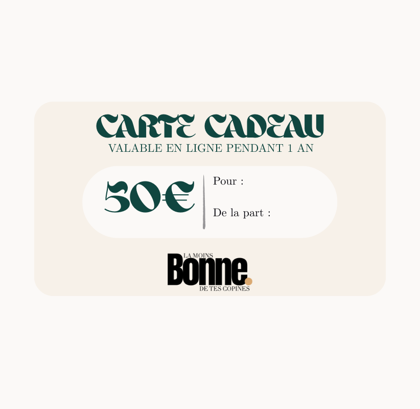 Offrez le cadeau parfait avec notre carte cadeau de 50€ ! Simple et pratique, elle permet à vos proches de choisir ce qui leur fait vraiment plaisir.