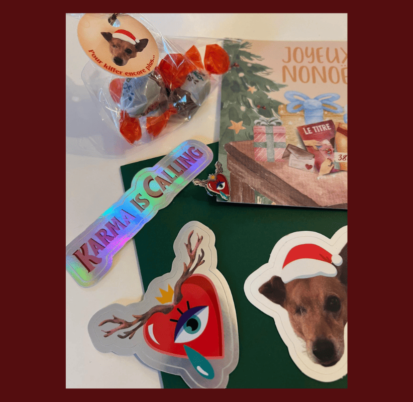 Cette enveloppe renferme des petites surprises sur le thème des romans de Coralie : pin’s, stickers, Schoko-bons, carte dédicacée (impression) et carte à gratter qui prédit ton avenir (si, si, j’te jure).